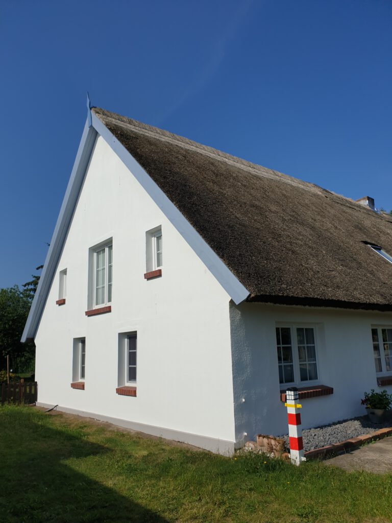 Das Fischerhaus am Strom ist ein typisches Gebäude der Region, wie es schon seit hunderten Jahren hier errichtet wird. Und manchmal ist auch noch das Schilfdach (auch Reet- oder Rohr- oder Riet-Dach genannt; je nach Region) erhalten. Seltener ist noch das Fachwerk sichtbar. Bei unserem Haus wurde schon vor vielen Jahren eine Außenwand vorgemauert und verputzt.